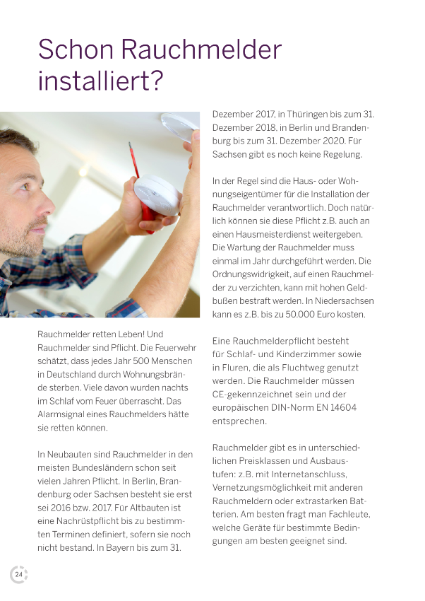 24 Rauchmelder retten Leben Und Rauchmelder sind Pflicht Die Feuerwehr schätzt dass jedes Jahr 500 Menschen in Deutschland durch Wohnungsbrän de sterben Viele davon wurden nachts im Schlaf vom Feuer überrascht Das Alarmsignal eines Rauchmelders hätte sie retten können In Neubauten sind Rauchmelder in den meisten Bundesländern schon seit vielen Jahren Pflicht In Berlin Bran denburg oder Sachsen besteht sie erst sei 2016 bzw 2017 Für Altbauten ist eine Nachrüstpflicht bis zu bestimm ten Terminen definiert sofern sie noch nicht bestand In Bayern bis zum 31 Dezember 2017 in Thüringen bis zum 31 Dezember 2018 in Berlin und Branden burg bis zum 31 Dezember 2020 Für Sachsen gibt es noch keine Regelung In der Regel sind die Haus oder Woh nungseigentümer für die Installation der Rauchmelder verantwortlich Doch natür lich können sie diese Pflicht z B auch an einen Hausmeisterdienst weitergeben Die Wartung der Rauchmelder muss einmal im Jahr durchgeführt werden Die Ordnungswidrigkeit auf einen Rauchmel der zu verzichten kann mit hohen Geld bußen bestraft werden In Niedersachsen kann es z B bis zu 50 000 Euro kosten Eine Rauchmelderpflicht besteht für Schlaf und Kinderzimmer sowie in Fluren die als Fluchtweg genutzt werden Die Rauchmelder müssen CE gekennzeichnet sein und der europäischen DIN Norm EN 14604 entsprechen Rauchmelder gibt es in unterschied lichen Preisklassen und Ausbaus tufen z B mit Internetanschluss Vernetzungsmöglichkeit mit anderen Rauchmeldern oder extrastarken Bat terien Am besten fragt man Fachleute welche Geräte für bestimmte Bedin gungen am besten geeignet sind Schon Rauchmelder installiert